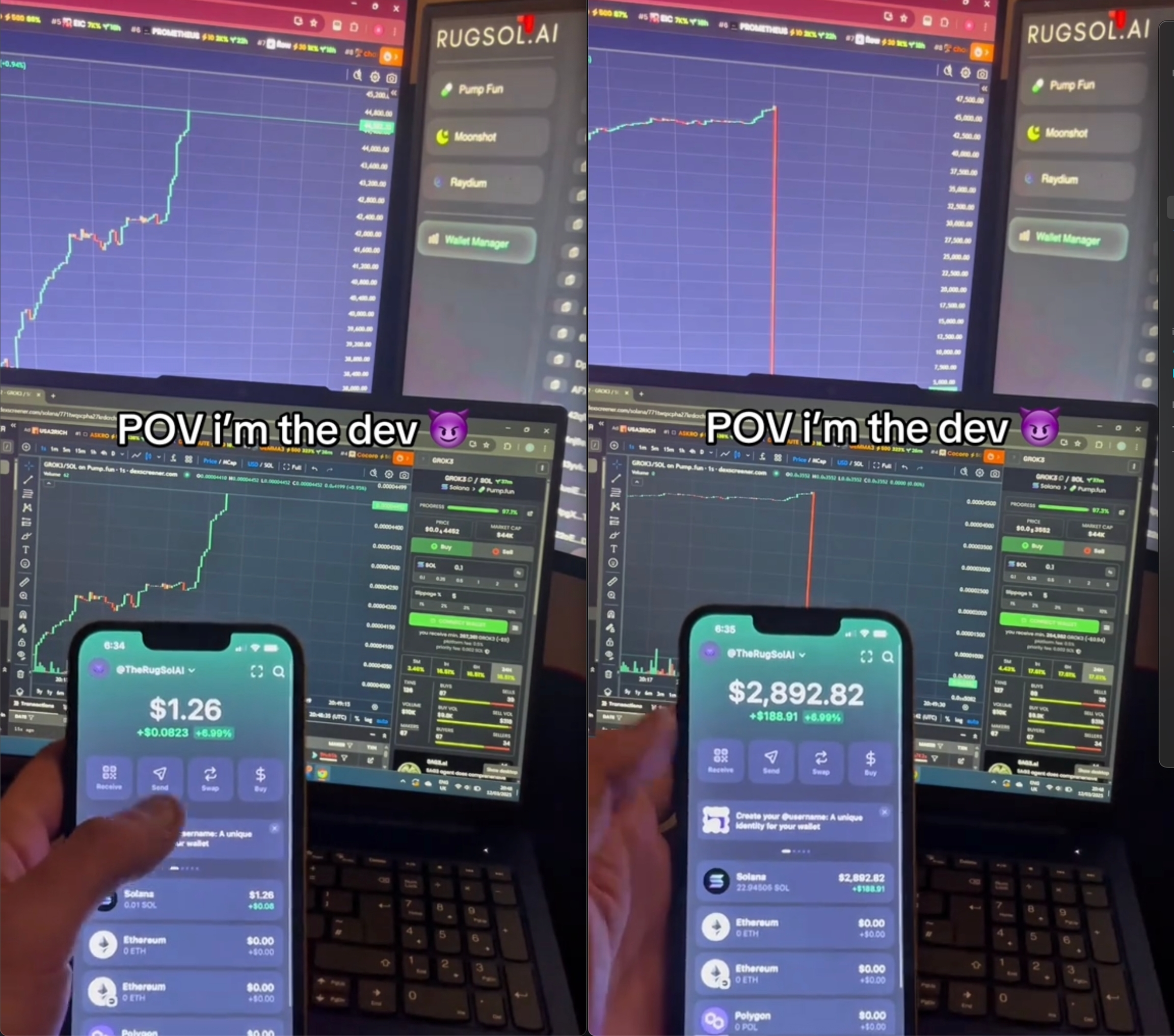 – The Rug Pull should be obvious: a sharp red candle going down – Swipe in Phantom right after the Rug Pull happens – Don’t reuse the same balance and tokens — change the numbers and tokens to make each creative look unique – Add captions that help convey the idea, such as: Easy at that. 10 to 60 SOL in one click Got rugpulled so hard had to rotate my screen POV I'm the dev – Add music: pick something motivational, tense, or trending – Keep the edit fast-paced — avoid dragging out scenes – One chart = multiple scenarios. You can recreate the Phantom wallet, change numbers and tokens, and shoot a new video with the same chart – Store your charts and use others shared in the group. You use theirs — they use yours. This way, everyone can create unique creatives faster